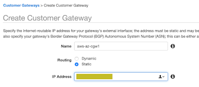 - Create a local network gateway on the Azure side using the VPG Public IPv4 Address and the VPC CIDR from AWS.