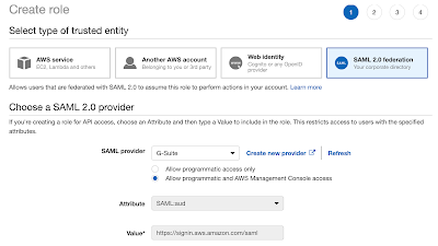 At some point (pre-2012), I signed up for G-Suite that had a limited but free set of services. I’ve continued to use those services, but wondered if I could federate this into my AWS environment. Seemed simple enough. You will need admin permissions both in your AWS account as well as G-Suite.