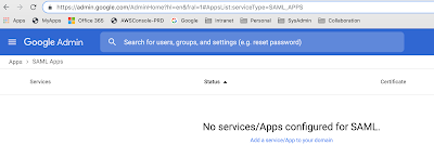 Log into your G-Suite Admin console https://admin.google.com and select “SAML Apps”